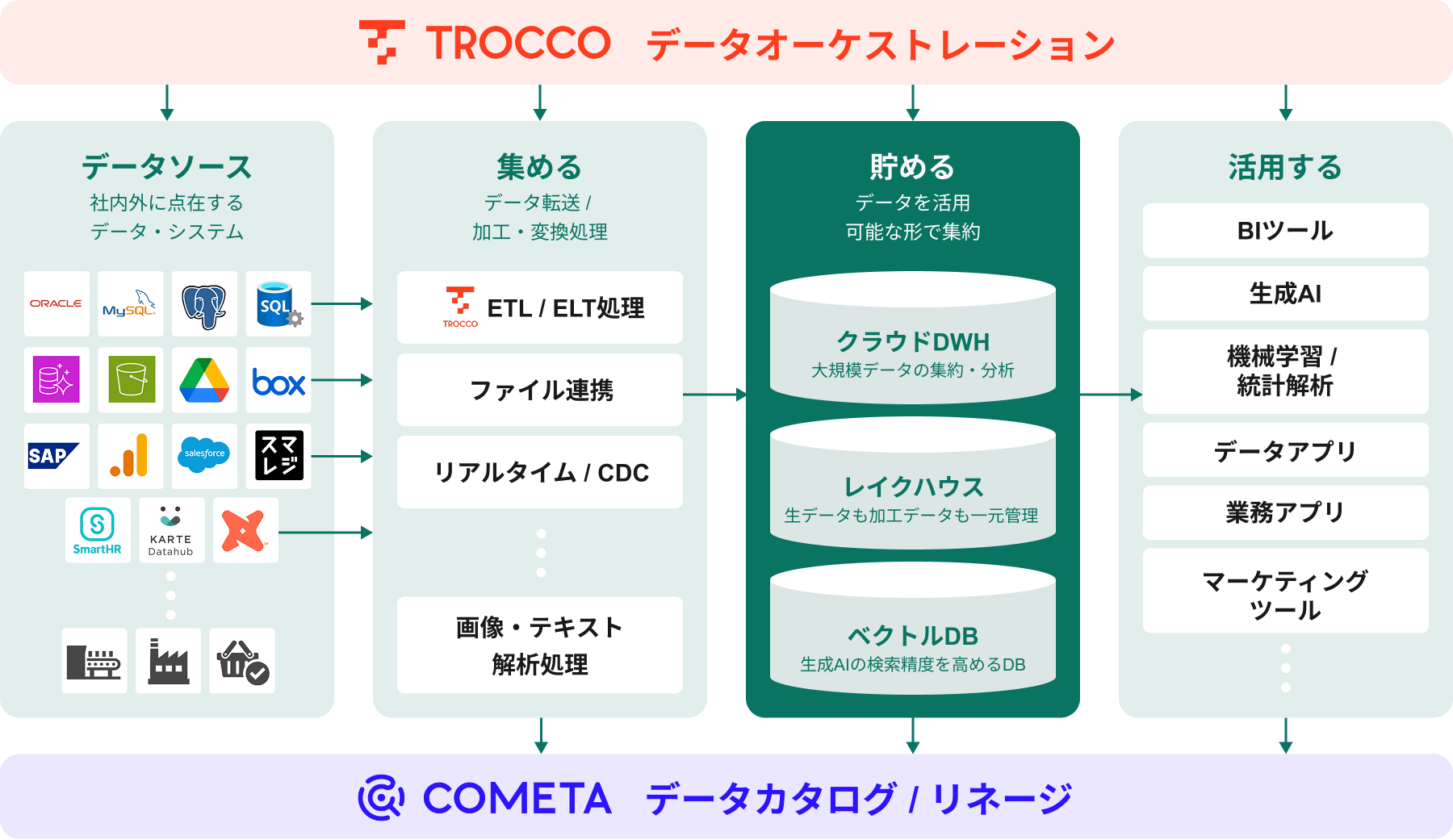 いいえ、必須ではありません。TROCCO・COMETAに限らず、お客様の既存環境やご要件に最適なアーキテクチャ・ツール選定をフラットにご提案します。Snowflake、Databricks、AWS、Google Cloud、Azureなど、主要なクラウドプラットフォームすべてに対応しています。