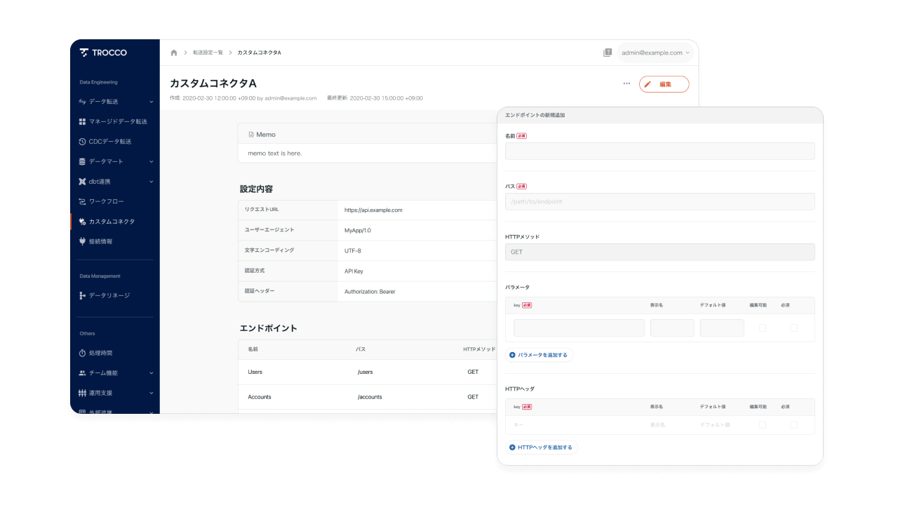 ユーザーやパートナー自身がノーコードに近い体験でコネクタを内製でき、 TROCCOで対応していないサービスのデータ連携が可能。一度作成したコネクタは繰り返し利用が可能で、 開発工数を削減できます。