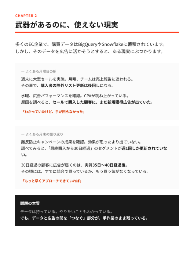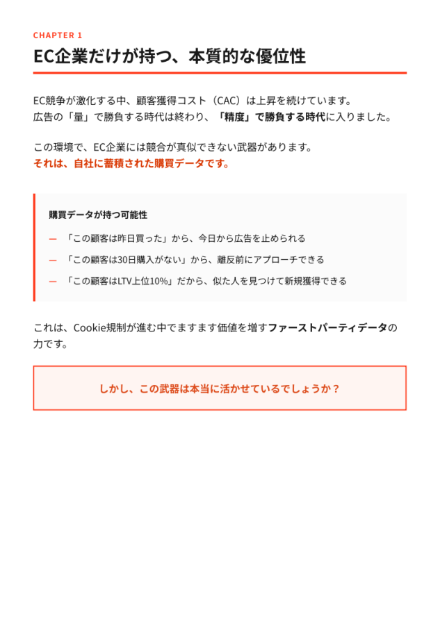 これに対して、有効な対策となり得るのが自社のみが保有する「ファーストパーティーデータ」を用いた広告のターゲッティングです。本ホワイトペーパーでは、これを効果的に実践する方法を解説します。